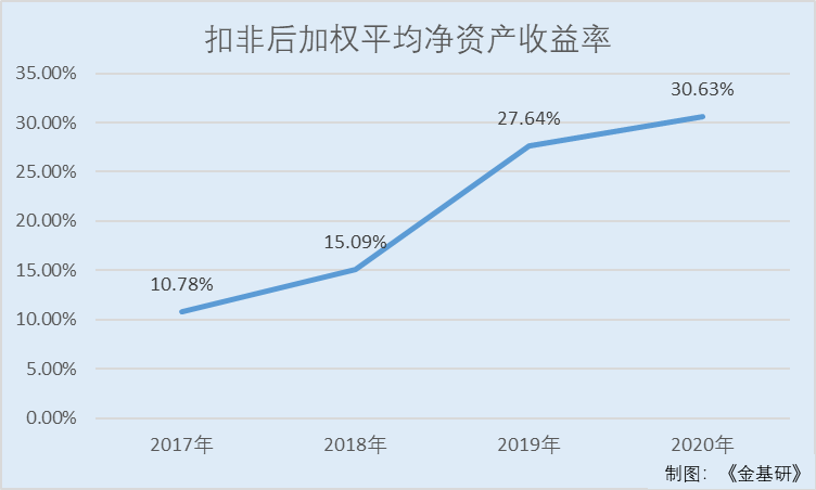 2017-2020年,大中矿业的扣非后加权平均净资产收益率分别为10.78%、15.09%、27.64%、30.63%。