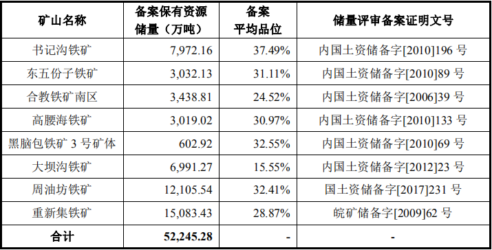 截至目前,大中矿业拥有内蒙和安徽两大矿山基地,经国土资源管理部门备案的铁矿石保有储量合计52,245.28万吨,约占全国查明储量的6.13‰(根据原国土资源部发布的《中国矿产资源报告(2019)》,中国查明铁矿资源储量约852.19亿吨),在独立铁矿采选企业中具有较大的储量优势。且平均品位不低于28.87%的占比为80.04%。