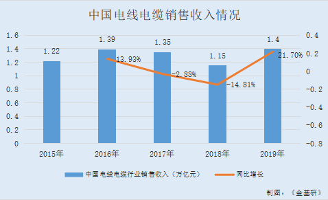据前瞻网数据,2015-2019年,中国电线电缆行业销售收入分别为1.22万亿元、1.39万亿元、1.35万亿元、1.15万亿元、1.4万亿元,2016-2019年分别同比增长13.93%、-2.88%、-14.81%、21.7%。
