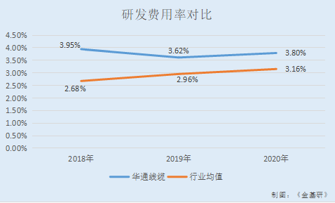 据东方财富Choice,2018-2020年,华通线缆的研发费用分别为1.03亿元、1.07亿元、1.28亿元,研发费用率分别为3.95%、3.62%、3.8%。