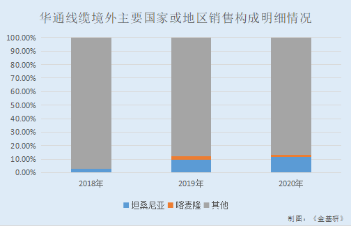 在境外主要国家或地区的销售构成明细情况中,华通线缆来自坦桑尼亚的外销收入分别为0.42亿元、1.62亿元、2.22亿元,占外销收入的比例分别为2.74%、9.39%、11.9%,2019年跃升至外销排名榜单第二位。
