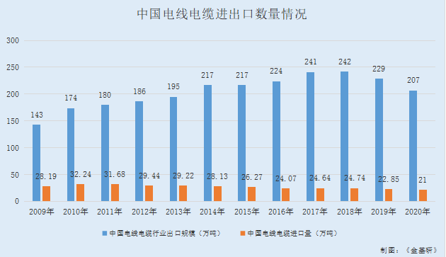 据中国海关数据,2009-2020年,中国电线电缆行业出口规模分别为143万吨、174万吨、180万吨、186万吨、195万吨、217万吨、217万吨、224万吨、241万吨、242万吨、229万吨、207万吨。