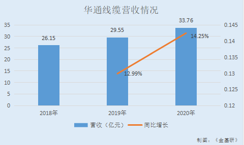 2018-2020年,华通线缆的营业收入分别为26.15亿元、29.55亿元、33.76亿元,2019-2020年分别同比增长12.99%、14.25%。