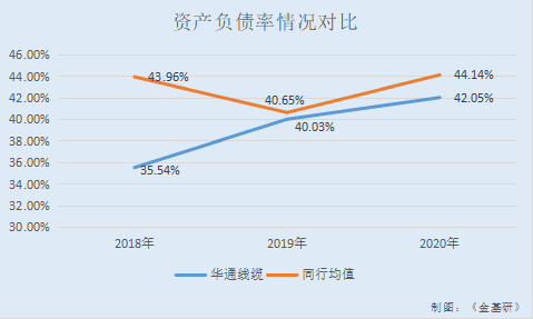 据东方财富Choice数据,2018-2020年,华通线缆的资产负债率分别为35.54%、40.03%、42.05%。
