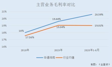 据招股书,2018-2019年及2020年1-6月,华通线缆的主营业务毛利率分别为18%、19.6%、20.59%。
