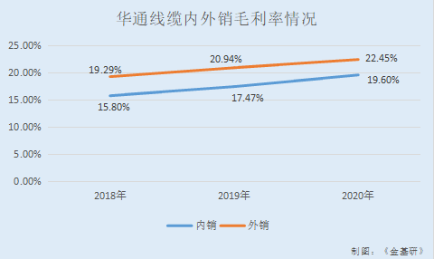 2018-2020年,华通线缆的内销毛利率分别为15.8%、17.47%、19.6%,外销毛利率分别为19.29%、20.94%、22.45%。