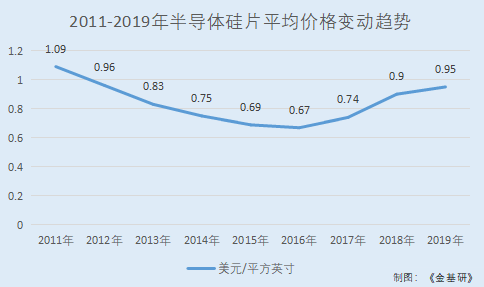 观往年半导体硅片,据公开信息,2011-2019年,半导体硅片平均价格分别为1.09美元/平方英寸、0.96美元/平方英寸、0.83美元/平方英寸、0.75美元/平方英寸、0.69美元/平方英寸、0.67美元/平方英寸、0.74美元/平方英寸、0.9美元/平方英寸、0.95美元/平方英寸。
