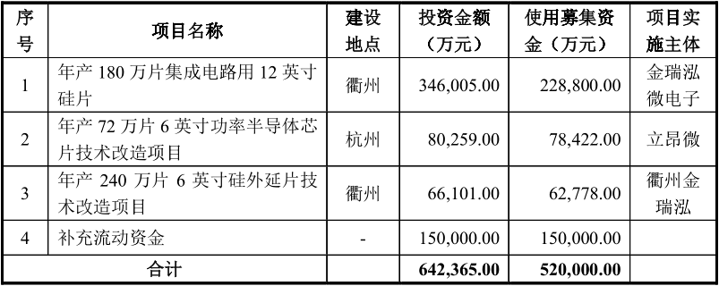 由于立昂微正处于快速扩张的阶段。为抓住5G移动通信、汽车电子等产业的发展机遇,增强资本实力,补充业务发展所需资金,丰富产品类型,提高生产能力,增强营运能力、提升盈利水平,进一步夯实在行业中的市场地位,立昂微于2021年3月12日公告了再融资项目的预案,拟发行募集资金总额(含发行费用)不超过52亿元,扣除发行费用后的募集资金净额将用于“年产180万片集成电路用12英寸硅片”、“年产72万片6英寸功率半导体芯片技术改造项目”、“年产240万片6英寸硅外延片技术改造项目”三个生产项目及补充流动资金。