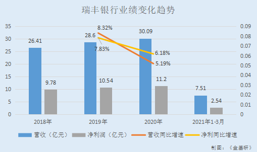 2021年一季度,瑞丰银行的营业收入为7.51亿元,同比增长-3.75%。同期,瑞丰银行的净利润为2.54亿元,同比增长7.88%。