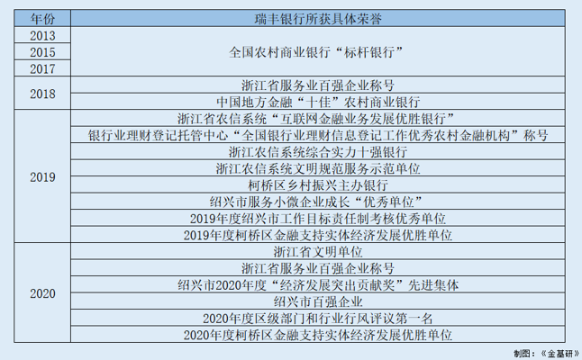 例如,瑞丰银行2013年、2015年、2017年三度被中国银监会评为全国农村商业银行“标杆银行”;连续多年被评为浙江农信系统“特级银行”、“十强银行”和“优胜单位”;当选绍兴市模范集体。