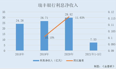 2021年一季度,瑞丰银行的利息净收入为7.33亿元,同比增长1.93%。