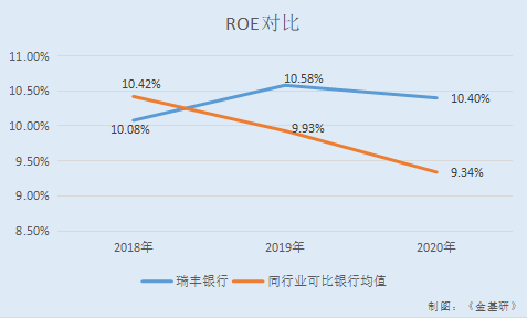 据东方财富Choice数据,2018-2020年,瑞丰银行扣除非经常性损益后的加权平均净资产收益率分别为10.08%、10.58%、10.4%。