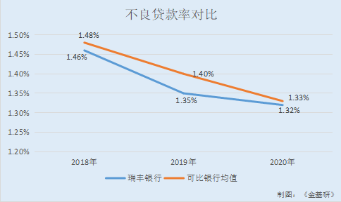 据东方财富Choice数据,2018-2020年,瑞丰银行不良贷款率分别为1.46%、1.35%、1.32%。