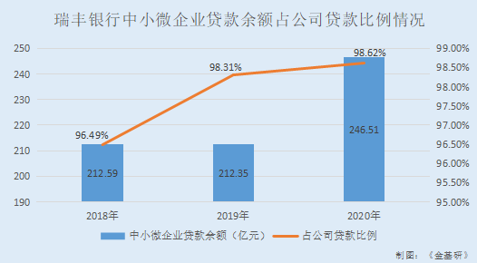 2018-2020年,瑞丰银行中小微企业贷款余额分别为212.59亿元、212.35亿元、246.51亿元,占公司贷款的比例分别为96.49%、98.31%、98.62%。