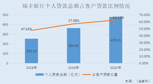 2018-2020年,瑞丰银行个人贷款总额分别为253.13亿元、364.42亿元、479.11亿元,占客户贷款的比重分别为47.63%、57.08%、62.52%,2019-2020年分别同比增长43.97%、31.47%。