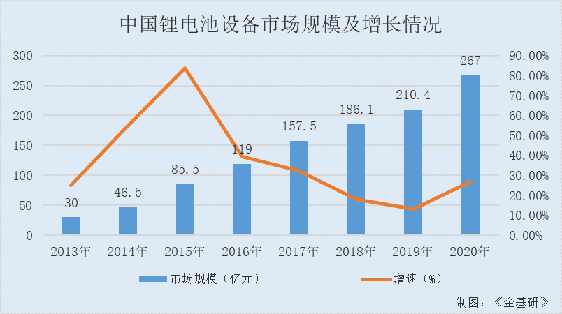 据签署日期为2021年6月10日的招股书(以下简称“招股书”)援引自CGII数据,2013-2020年,中国锂电设备市场规模分别为30亿元、46.5亿元、85.5亿元、119亿元、157.5亿元、186.1亿元、210.4亿元、267亿元,同期分别同比增长25%、55%、83.9%、39.2%、32.4%、18.2%、13.1%、26.9%。