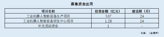 其中,“工业机器人智能装备生产项目”拟使用募集资金5.67亿元,“工业机器人智能装备研发中心项目”拟使用募集资金1.28亿元。