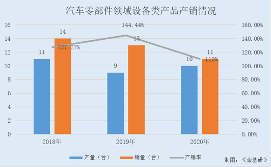 2018-2020年,利元亨在汽车零部件领域设备类产品的产量分别为11台、9台、10台;销量分别为14台、13台、11台;产销率分别为127.27%、144.44%、110%。