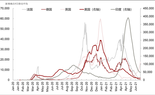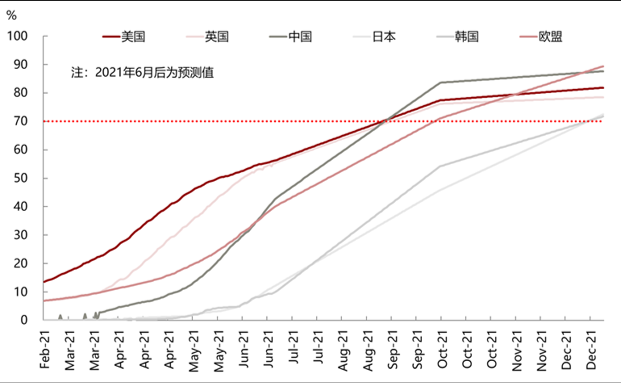 海外方面,疫情受控与经济加速开放是大方向。随着疫苗接种和疫情防控的逐步推进,全球疫情确诊数量大体呈现回落态势。美国经济将迎来更均衡的复苏,根据鹏华基金测算,在私人部门服务消费与复工复产加速的带动下,预计美国Q3实际GDP环比折年率从Q2的约7%上升至Q3的9.5%以上,Q4预计也会维持高位,全年同比增速7%(此前一致预期6.5%)。美国财政政策重心也逐渐从应对疫情转向经济重建,在疫苗对经济的积极作用下,通胀持续超预期,就业市场改善动能强劲。