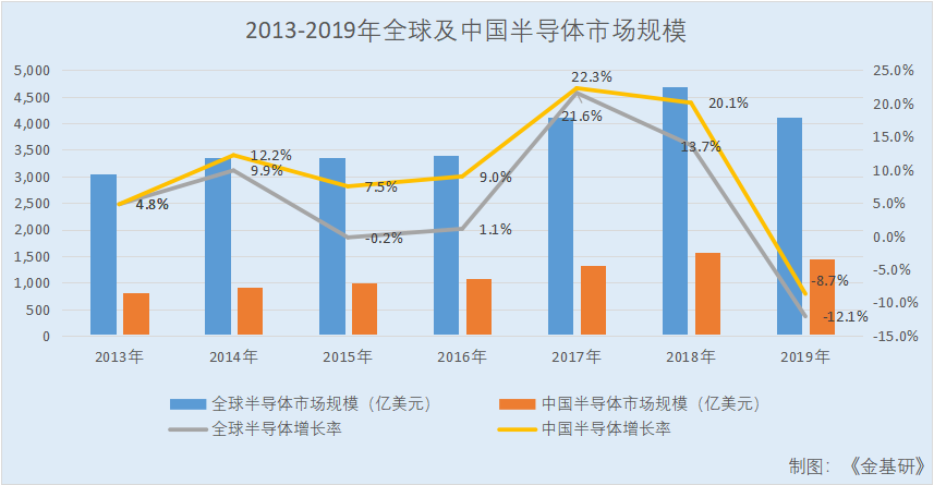 2013-2019年,中国半导体市场规模分别为817亿美元、917亿美元、986亿美元、1,075亿美元、1,315亿美元、1,579亿美元、1,441亿美元;同期,中国半导体行业市场规模增速分别为4.8%、12.2%、7.5%、9%、22.3%、20.1%、-8.7%。