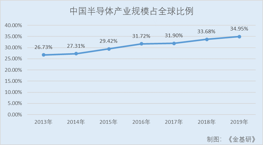 也就是说,2013-2019年,中国半导体产业规模占全球半导体产业规模比分别为26.73%、27.31%、29.42%、31.72%、31.9%、33.68%、34.95%。