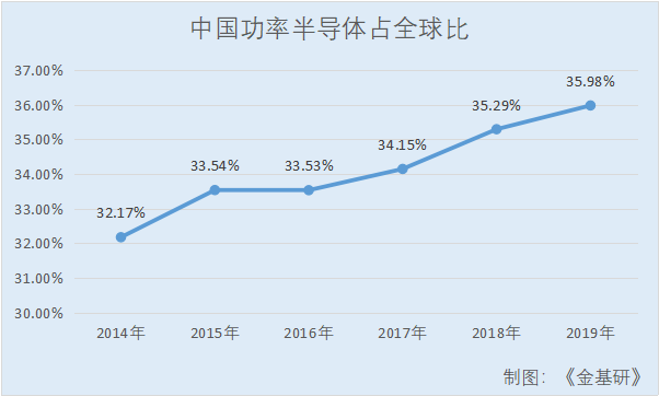由上述可知,2014-2019年,中国功率半导体器件市场规模占全球功率半导体器件市场规模比例分别为32.17%、33.54%、33.53%、34.15%、35.29%、35.98%。