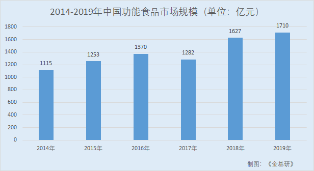 近年来,中国功能食品市场规模整体呈现逐年增长的趋势。2019年,中国功能食品市场规模达到1710亿元。