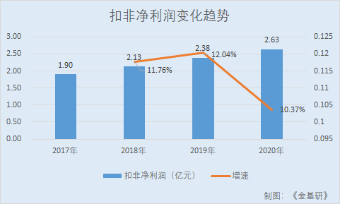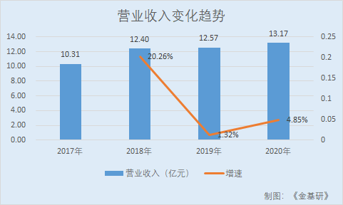 其中,2017-2020年营业收入分别为10.31亿元、12.40亿元、12.57亿元、13.17亿元。2018-2020年,同比增长分别为20.26%、1.32%、4.85%。