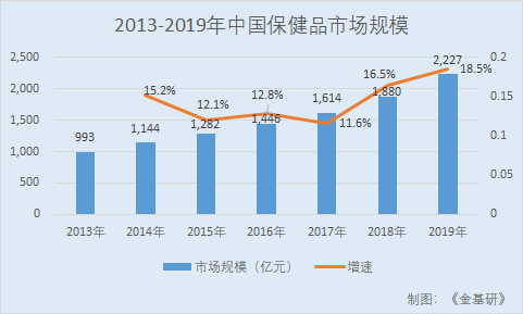 2013-2019年,中国保健品市场规模为993亿元、1,144亿元、1,282亿元、1,446亿元、1,614亿元、1,880亿元、2,227亿元。2014-2019年,中国保健品市场的增速为15.2%、12.1%、12.8%、11.6%、16.5%、18.5%。