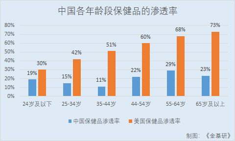 整体来看,与美国相比,中国的保健品渗透率普遍较低,且差距较大。