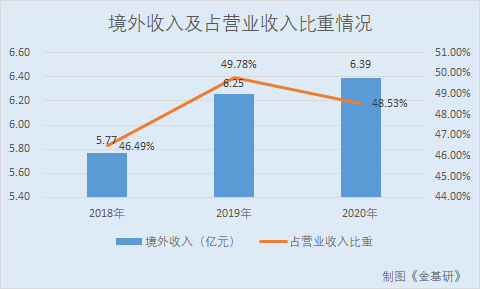 2018-2020年,新诺威境外营业收入分别为5.77亿元、6.25亿元、6.39亿元。同期,境外收入占营业收入的比重分别为46.49%、49.78%、48.53%。