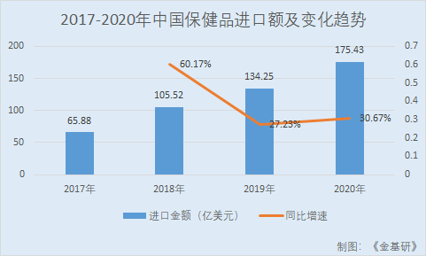 根据数据显示,2017-2020年中国保健品进口额分别为65.88亿美元、105.52亿美元、134.25亿美元、175.43亿美元。其中,2018-2020年,同比增速分别为60.17% 、27.23%、30.67%。