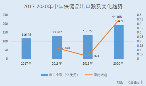 根据数据显示,2017-2020年中国保健品出口额分别为116.45亿美元、130.82亿美元、135.22亿美元、194.93亿美元。其中,2018-2020年,同比增速分别为12.34%、3.36%、44.16%。