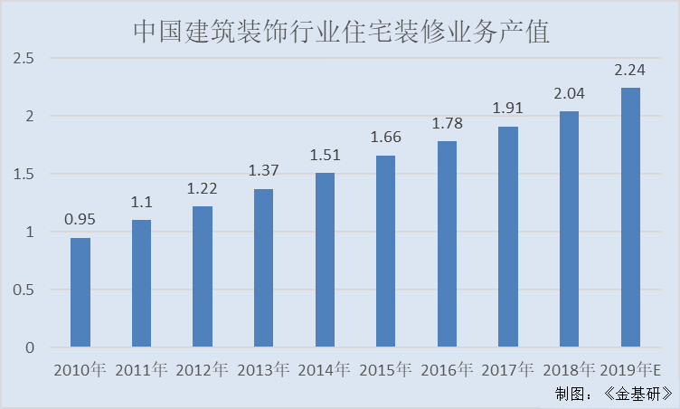 根据中国建筑装饰协会公布的统计数据,近年来,中国住宅装饰市场规模持续扩大,产值从2008年的0.85万亿元增加到2018年的2.04万亿元,总规模扩大了1.19万亿元,复合增长率为9.15%。