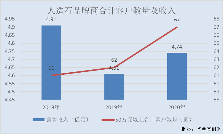 其中,中旗新材的客户以家居企业和石英石品牌商为主。2018-2020年,中旗新材上述两类的客户(50万元以上)合计家数分别为61家、62家和67家,收入合计分别为4.91亿元、4.61亿元和4.74亿元,收入占比分别为86.83%、87.15%和85.51%,收入结构基本保持稳定。