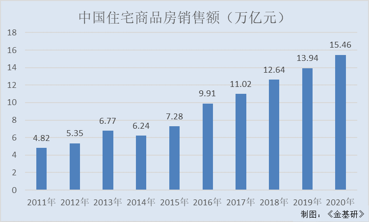 近年来在国家宏观调控政策的影响下,中国房地产市场整体呈现出平稳健康发展的态势。国家统计局的数据显示,中国住宅商品房销售额从2011年的4.82亿元增加至2020年的15.46万亿元。