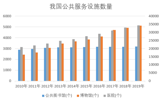 根据国家统计局公布的数据,2019年,中国共有公共图书馆3,196个、博物馆5,119个、医院34,354个,2010-2019年间复合增长率分别为1.15%、8.61%、5.67%,呈现稳定增长的态势。