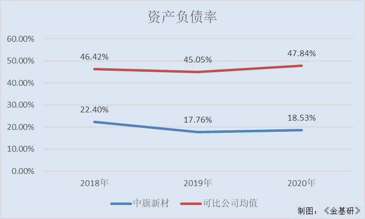 2018-2020年,中旗新材的资产负债率分别为22.4%、17.76%、18.53%,呈下降趋势;同期,中旗新材可比公司惠达卫浴、海鸥住工、凯伦股份、东方雨虹、本益新材的资产负债率均值分别为46.42%、45.05%、47.84%。