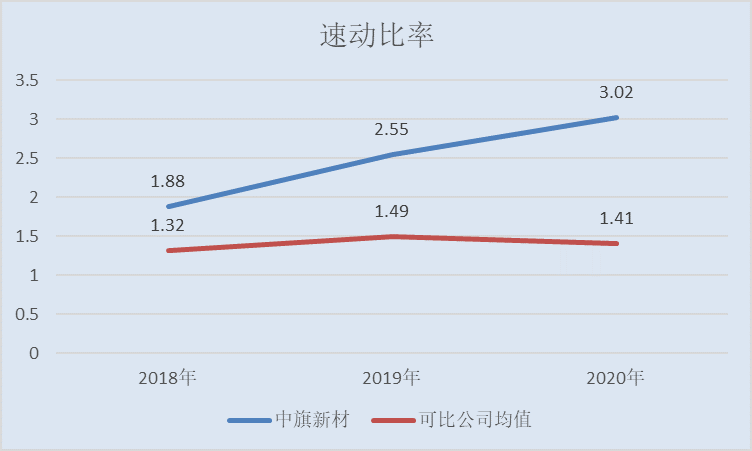 同期,中旗新材的速动比率分别为1.88倍、2.55倍、3.02倍,同期,可比公司惠达卫浴、海鸥住工、凯伦股份、东方雨虹、本益新材的流动比率均值分别为1.32倍、1.49倍、1.41倍。