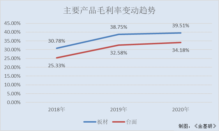 2018-2020年,中旗新材板材的毛利率分别为30.78%、38.75%和39.51%,台面的毛利率分别为25.33%、32.58%和34.18%。