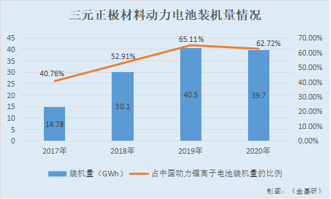 根据中国化学与物理电源行业协会动力电池应用分会数据,2017-2020年,中国动力锂离子电池装机量分别为36.26GWh、56.89GWh、62.2GWh、63.3GWh,其中三元正极材料动力电池装机量分别为14.78GWh、30.1GWh、40.5GWh、39.7GWh,占比分别为40.76%、52.91%、65.11%、62.72%,三元正极材料动力电池装机量占比整体呈逐步上升态势。