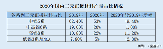 根据鑫椤资讯数据,2020年国内三元正极材料累计产量约21万吨。其中,中镍5系产量占比53%,较2019年下降9.4个百分点;中高镍6系产量占比20%,较2019年增加1个百分点;高镍8系产量占比22%,较2019年增加11.2个百分点;低镍3系及NCA产量合计占比5%,较2019年下降2.8个百分点;中高镍、高镍三元正极材料2020年产量占比合计增加12.2个百分点。