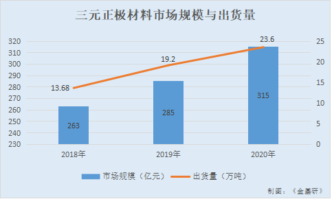 根据高工产研锂电研究所(GGII)调研数据,2018-2020年,三元正极材料市场规模分别为263亿元、285亿元、315亿元,同比增速分别为52.6%、8.37%、10.53%。同期,中国三元正极材料出货量分别为13.68万吨、19.2万吨、23.6万吨,同比增速分别为58.89%、40.35%、22.92%。