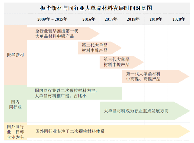 例如,振华新材2009年在国内外较早完成镍钴锰酸锂三元正极材料一次颗粒大单晶材料的研发及生产,为行业内大单晶系列产品成为国内主流动力电池三元正极材料之一做出一定贡献。