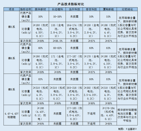 更值得一提的是,根据公开渠道查询到的与同行业可比公司同类产品技术性能指标的对比情况,振华新材镍5系、镍6系、镍8系产品的比容量方面具有相对优势。