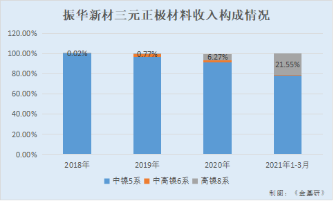 振华新材高镍8系NCM三元正极材料于2018年向客户送样并于2019年开始批量供货。自2020年下半年以来,随着振华新材高镍8系NCM三元正极材料与客户产品平台的不断磨合,产品性能逐步得到客户认可并通过客户的电池产品对接国内外主流车型,振华新材2021年1-3月高镍8系NCM三元材料销售收入占比提升。毛利率相对较高的高镍8系NCM三元材料销售占比提升,助推振华新材2021年1-3月毛利率上升。