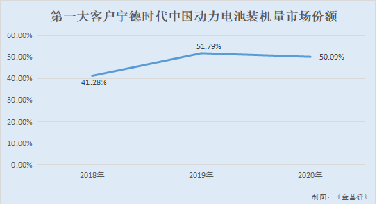 根据高工锂电(GGII)调研数据,2018-2020年,中国动力电池装机量第一名宁德时代的市场份额分别为41.28%、51.79%、50.09%,呈增长趋势,具有显著的行业领先优势,未来存在金额及占比进一步增加的可能性。