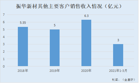 2018-2020年及2021年1-3月,振华新材对上述其他主要客户的销售收入分别为5.35亿元、5亿元、6.3亿元、3亿元,整体呈增长态势,反映振华新材其他客户开发成效已逐步显现。