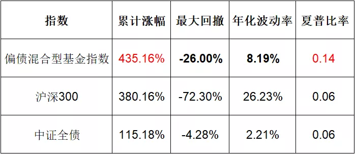 偏债混合基金指数近17年的最大回撤、年化波动率等风险指标分别为26%、8.19%,均只处于沪深300高波动水平的1/3。