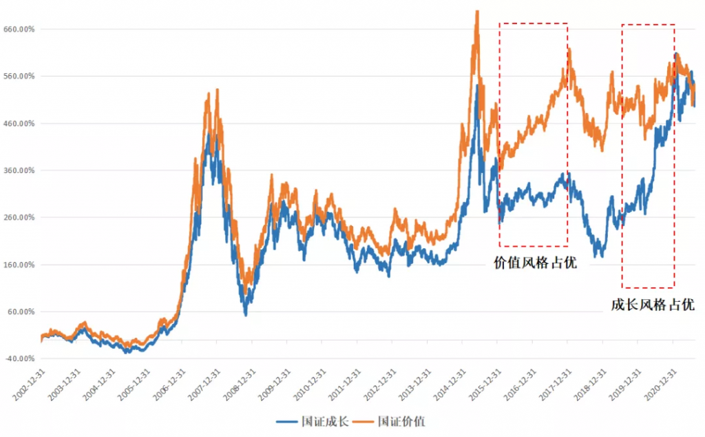 实际上,回溯近十几年A股历史,以国证价值、国证成长为代表的风格指数长期处于轮换态势。特别是2016年至20117年,价值风格明显占优;2019年中旬至2020年则轮换为强烈的成长风格。